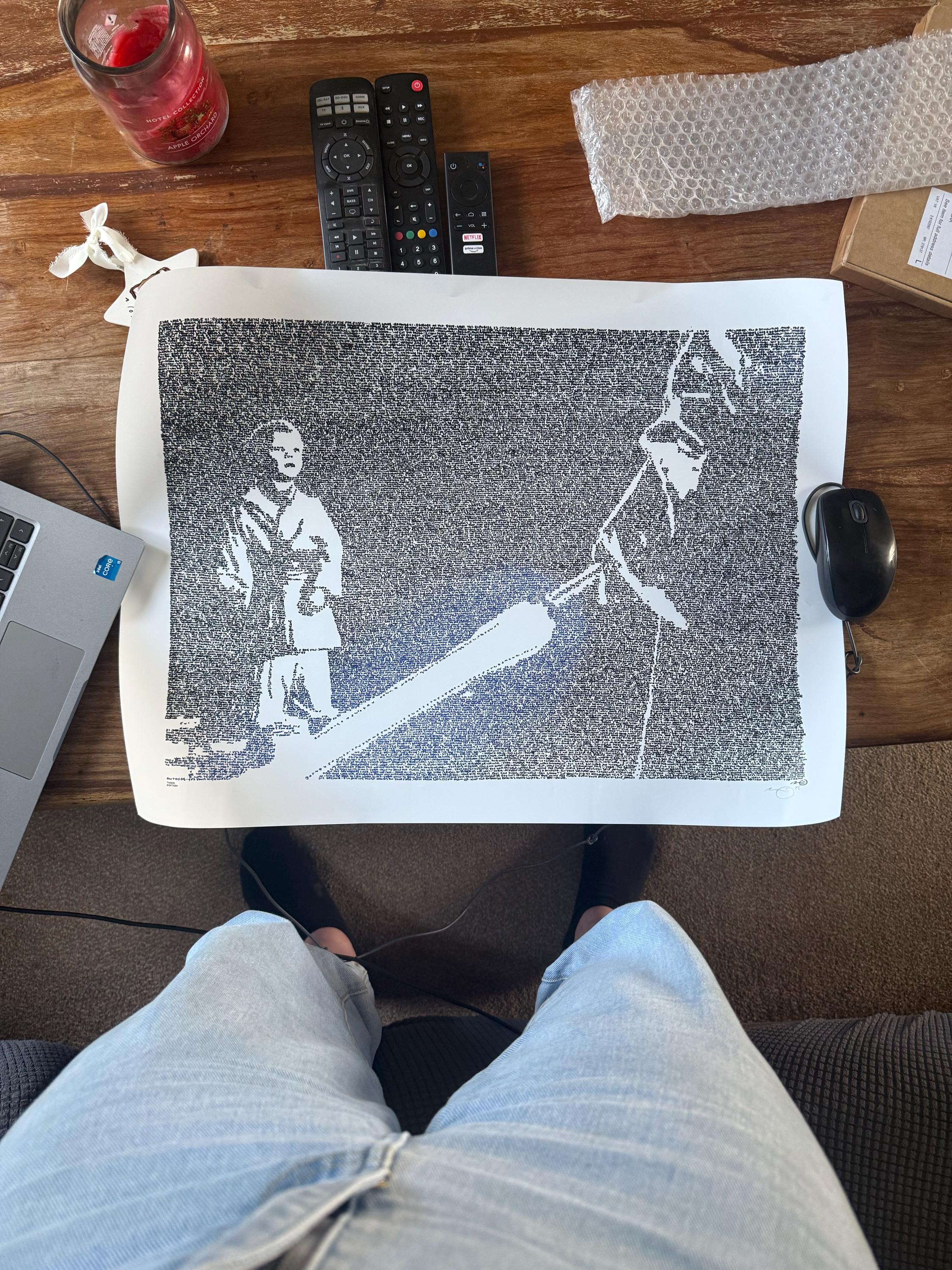 The poster was made by sitting down and writing out each word with a pen, line by line, down the page and increasing and decreasing the space between the letters until the portrait emerged. Over 40+ hours of writing and craftsmanship.